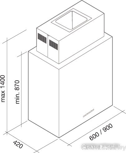 монтаж островной, ширина 90 см, управление электронное/кнопочное, производительность вытяжки 705 м3/ч, производительность мотора 800 м3/ч