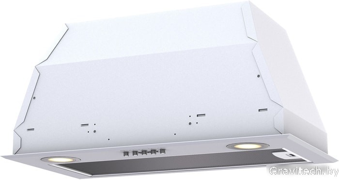 конструкция скрытая, монтаж для встраивания, ширина 52.5 см, управление механическое/кнопочное, производительность мотора 550 м3/ч, цвет белый