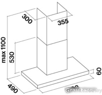 конструкция Т-образная, монтаж настенный, ширина 120 см, управление электронное/кнопочное, производительность вытяжки 490 м3/ч, производительность мотора 1280 м3/ч, цвет нержавеющая сталь