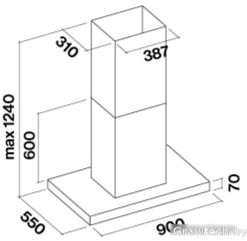 конструкция Т-образная, монтаж островной, ширина 90 см, управление электронное/кнопочное, производительность вытяжки 490 м3/ч, производительность мотора 1280 м3/ч, цвет нержавеющая сталь