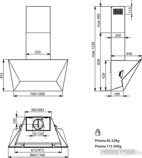 Кухонная вытяжка Falmec Prisma Design+ 85 800 м3/ч (черный)