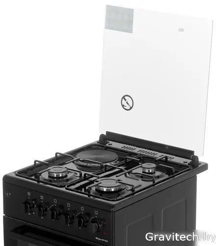 газ+электро панель + электрический духовой шкаф, газ-контроль конфорок, поверхность: эмалированная сталь, крышка из закалённого стекла, энергопотребление A, управление механическое, без таймера, размеры (ШхГхВ): 50x57x85 см, цвет черный