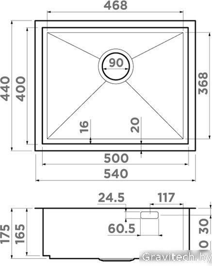 врезная под столешницу, нержавеющая сталь, размеры: 54x44 см, глубина чаши: 17.5 см, в шкаф шириной от 60 см
