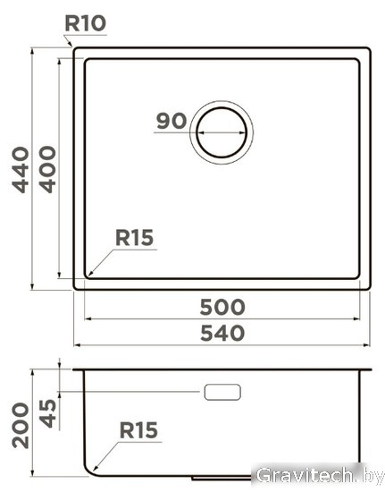 врезная на столешницу/врезная под столешницу/врезная вровень со столешницей, нержавеющая сталь, размеры: 54x44 см, глубина чаши: 20 см, в шкаф шириной от 60 см
