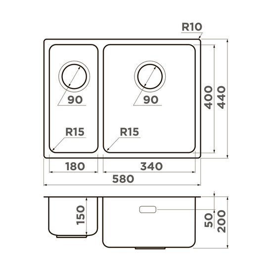 врезная на столешницу/врезная под столешницу/врезная вровень со столешницей, нержавеющая сталь, размеры: 58x44 см, глубина чаши: 20 см, в шкаф шириной от 60 см