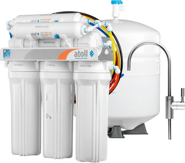 Элементов префильтрации 3 картриджа:; atoll P5. Механическая очистка через пропиленовый фильтр с порами размером 5 микрон. Удаляет нерастворимые частицы: глину, песок, ржавчину;; atoll GАС-10. Активный компонент — гранулированный активированный уг |