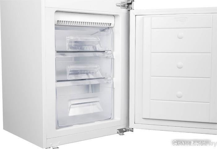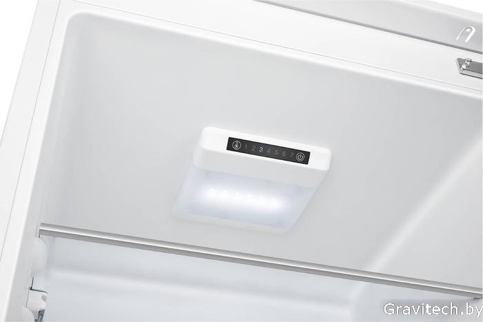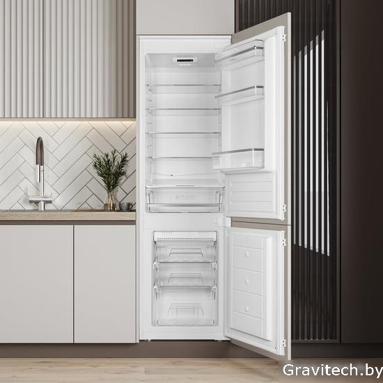 встраиваемый, полный No Frost, электронное управление, класс A+, полезный объём: 238 л (182 + 56 л), перенавешиваемые двери, лоток для яиц, 54x54x176.9 см, белый