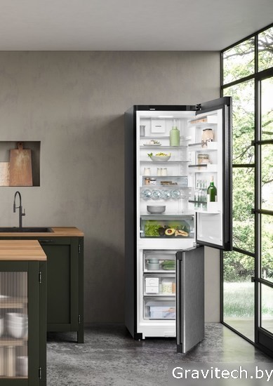 отдельностоящий, No Frost (морозильная камера), электронное управление, класс A++, полезный объём: 360 л (266 + 94 л), перенавешиваемые двери, автодоводчик дверей, складная полка, полка для вина, лоток для яиц, 59.7x67.5x201.5 см, темная сталь