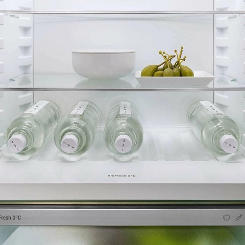 А если напитков слишком много? Тогда встроенная полка для бутылок над секцией BioFresh придется как нельзя кстати. Просто уберите стекло над полкой и положите бутылки в углубления. Вскоре они будут охлаждены и готовы к подаче.