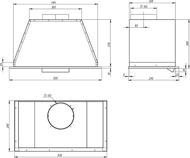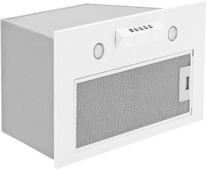 конструкция скрытая, монтаж для встраивания, ширина 53 см, управление электронное/кнопочное, производительность мотора 1250 м?/ч, цвет белый