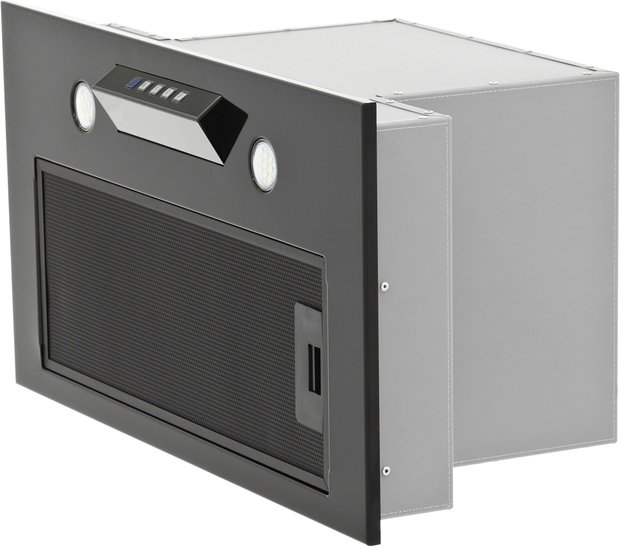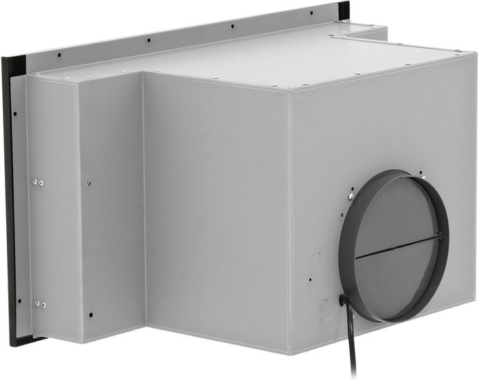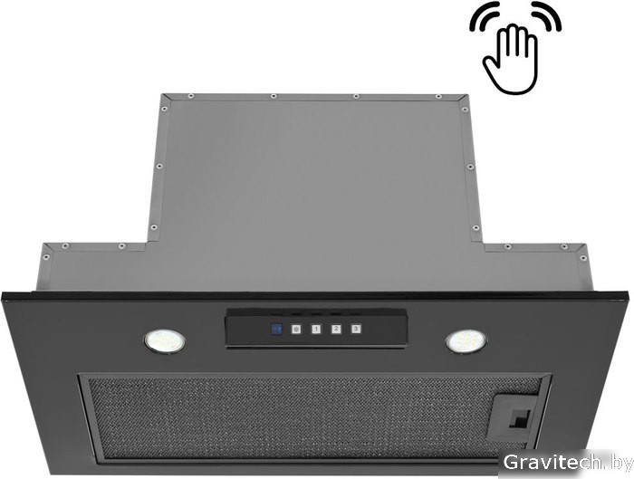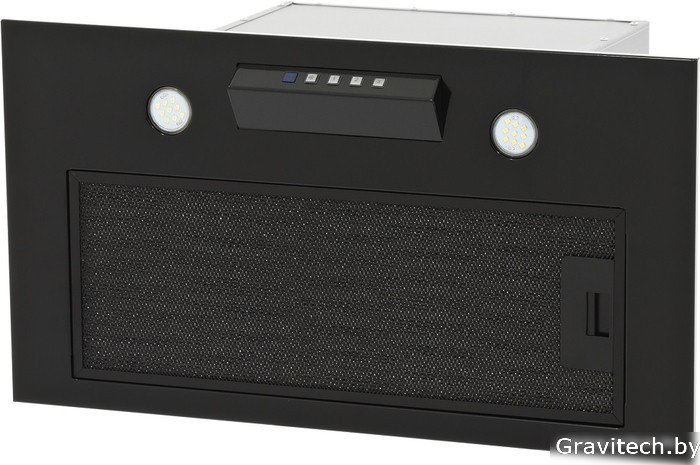 конструкция скрытая, монтаж для встраивания, ширина 53 см, управление электронное/кнопочное, производительность мотора 1250 м3/ч, цвет черный