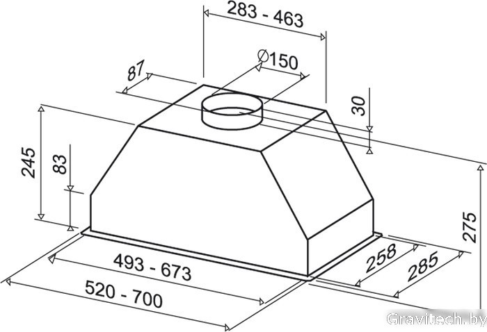 конструкция скрытая, монтаж для встраивания, ширина 52 см, управление электронное/кнопочное, производительность мотора 650 м3/ч, цвет серый