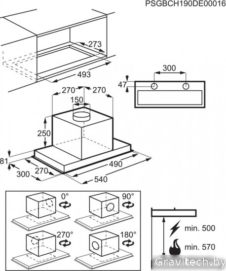 конструкция скрытая, монтаж настенный/для встраивания, ширина 54 см, управление электронное/кнопочное, производительность вытяжки 580 м?/ч, цвет нержавеющая сталь/черный