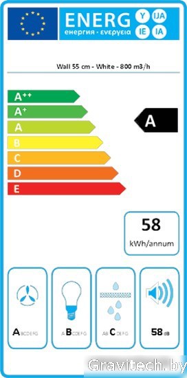 конструкция наклонная, монтаж настенный, ширина 55 см, управление электронное/кнопочное, производительность вытяжки 500 м3/ч, цвет нержавеющая сталь/черный