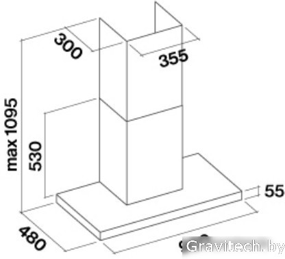 конструкция Т-образная, монтаж настенный, ширина 90 см, управление сенсорное, производительность вытяжки 715 м3/ч, производительность мотора 1280 м3/ч, цвет белый/нержавеющая сталь