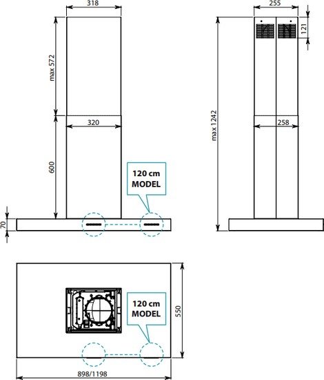 конструкция Т-образная, монтаж островной, ширина 89.8 см, управление электронное/кнопочное, производительность вытяжки 520 м3/ч, производительность мотора 800 м3/ч, цвет нержавеющая сталь