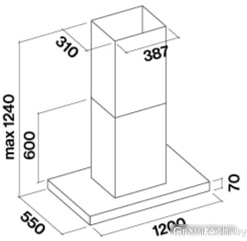 конструкция Т-образная, монтаж островной, ширина 120 см, управление электронное/кнопочное, производительность вытяжки 490 м3/ч, производительность мотора 1280 м3/ч, цвет нержавеющая сталь