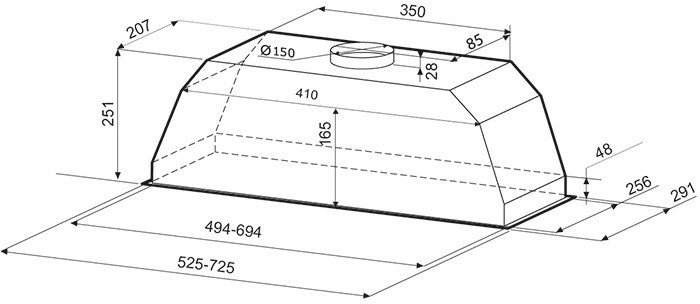 конструкция скрытая, монтаж для встраивания, ширина 52.5 см, управление механическое/кнопочное, производительность мотора 550 м3/ч, цвет белый
