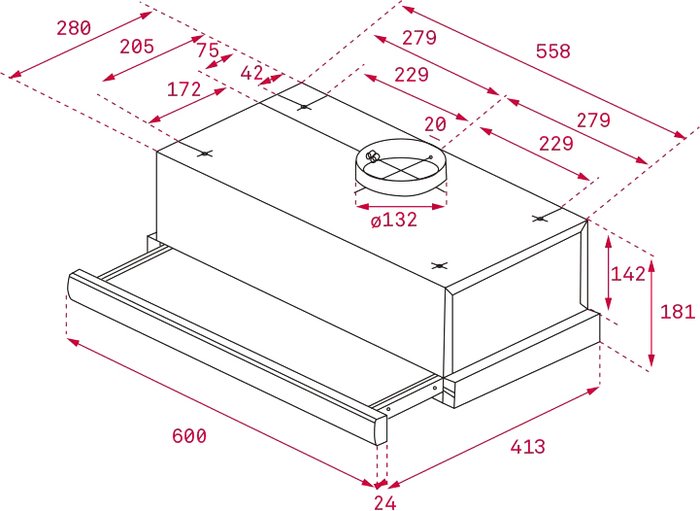 конструкция телескопическая, монтаж для встраивания, ширина 60 см, управление механическое, производительность вытяжки 332 м3/ч, цвет нержавеющая сталь