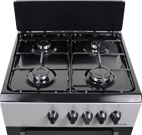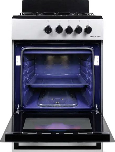 варочная поверхность: газовая на 4 конфорки, эмалированная сталь; духовой шкаф: газовый, объем 52.8 л, 2 стекла в дверце; управление механическое, газ-контроль, размеры (ШхГхВ): 50x57x85 см, цвет серый