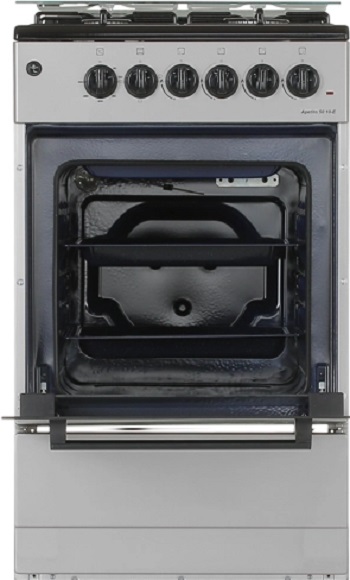 варочная поверхность: газовая на 4 конфорки, эмалированная сталь; духовой шкаф: электрический, объем 52.8 л, 2 стекла в дверце; управление механическое, газ-контроль, электроподжиг, термостат, подсветка духовки, размеры (ШхГхВ): 50x57x85 см, цвет серый