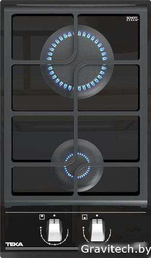 газовая на 2 конфорки, cтеклокерамика, мощность: 3800 Вт, автоматический электроподжиг, газ-контроль, решетки: чугун, независимая установка, размеры (ШхГ): 30x51 см